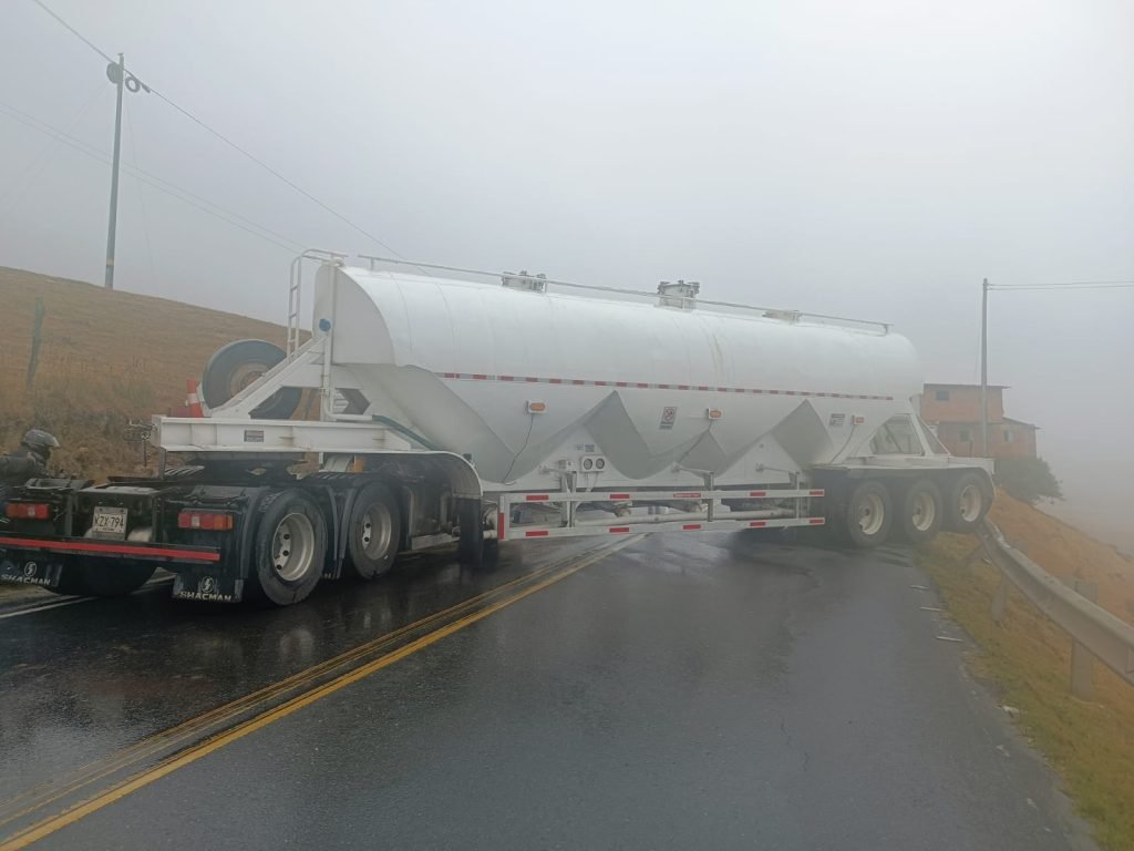 Varios conductores se encuentran a la espera de una grúa para poder estabilizar de nuevo el pesado automotor. Por fortuna no se reportaron lesionados ni daños materiales.