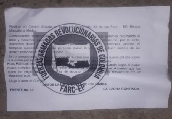 El mensaje según la comunidad llegó a otros municipios como Santa Helena, Guacamayo, Landázuri y Vélez hasta donde habrían llegado otro grupo de motorizados.