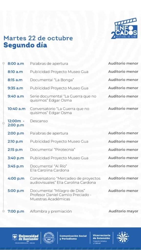El segundo día se proyectará la serie documental “La Guerra que no quisimos”, proyectos estudiantiles y conversatorios entre otras actividades dirigidas al análisis de nuestra realidad en Colombia, su entorno, y la búsqueda de iniciativas para un mejor futuro. (Ver imagen).