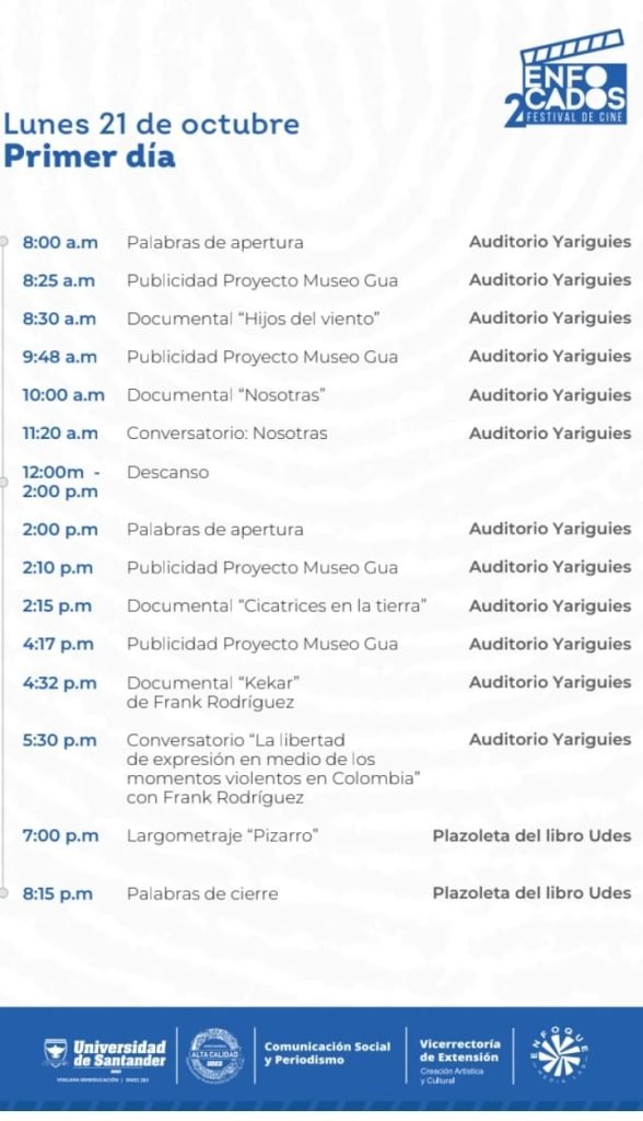 Entre la agenda del lunes se mostrará al público documentales como «Cicatrices en la tierra», «Kekar», «Hijos del Viento» así como el largometraje «Pizarro» así como la creación de espacios para los conversatorios (Ver imagen)