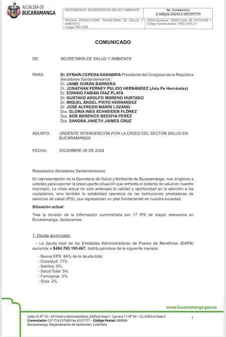 “En representación de la Secretaría de Salud de Bucaramanga nos dirigimos a ustedes para exponer la preocupante situación que enfrenta el sistema en nuestro municipio. La crisis actual no solo amenaza la calidad en la atención a los ciudadanos, sino también la estabilidad operativa de las instituciones prestadoras de servicios, que es un pilar fundamental en nuestra sociedad” indicó la funcionaria.