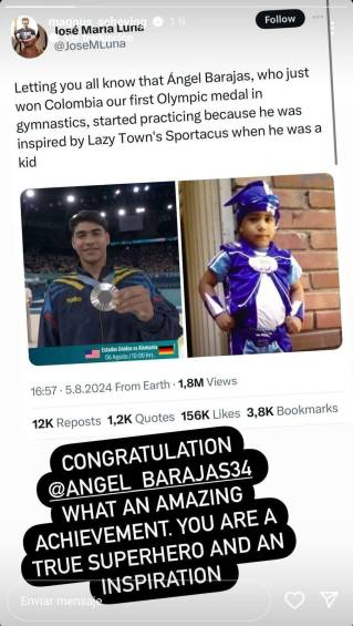 Ángel Barajas, el gimnasta colombiano que conquistó la medalla de plata en los Juegos Olímpicos de París 2024, recibió un emotivo mensaje de felicitaciones de Magnus Scheving, el actor y gimnasta islandés que interpretó al superhéroe Sportacus en el programa infantil LazyTown.