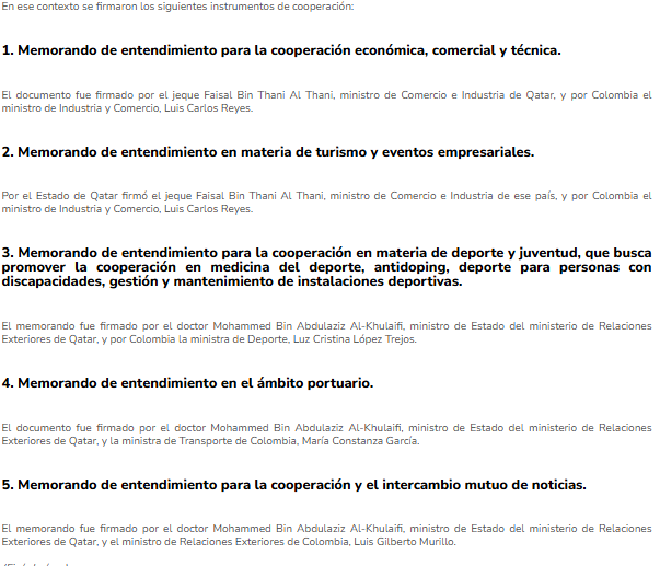 En el marco de la visita oficial del emir de Qatar, Tamim bin Hamad Al Thani, Colombia y Qatar consolidaron su relación bilateral con la suscripción de cinco instrumentos de cooperación que abarcan áreas estratégicas como cultura, deportes, comercio y política. Este encuentro, presidido por el presidente Gustavo Petro, reafirma el interés de ambos países por profundizar los lazos diplomáticos y comerciales.