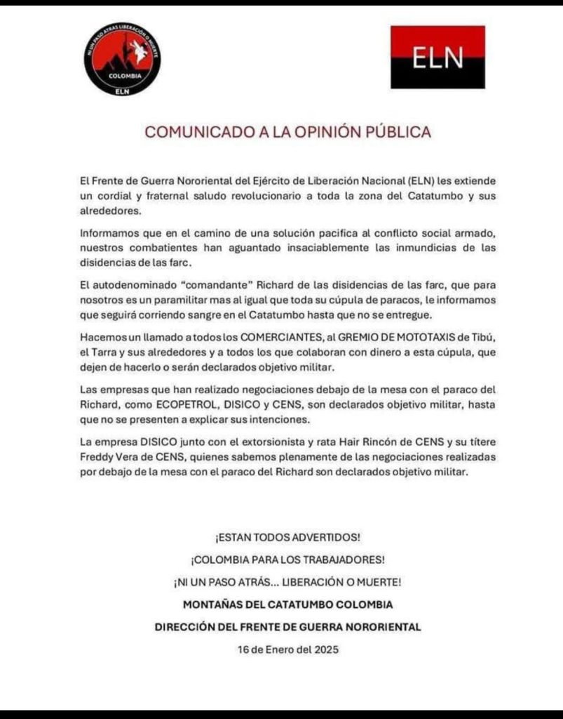 La región del Catatumbo, en el nororiente de Colombia, atraviesa una grave crisis de orden público debido a la disputa territorial entre el Ejército de Liberación Nacional (ELN) y las disidencias de las Farc. En medio de este conflicto, el frente de Guerra Nororiental del ELN emitió un comunicado en el que amenaza a mototaxistas, comerciantes y empresas como Ecopetrol, Disico y Cens.