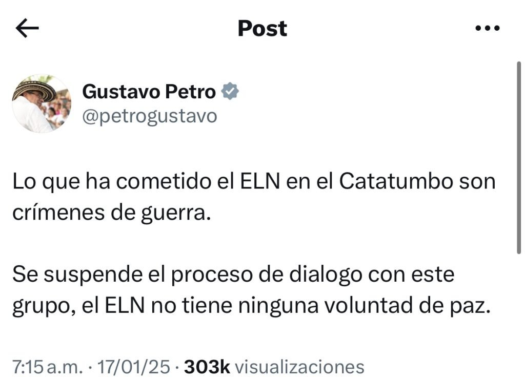 “Lo que ha cometido el ELN en el Catatumbo son crímenes de guerra. Se suspende el proceso de diálogo con este grupo, el ELN no tiene ninguna voluntad de paz.”