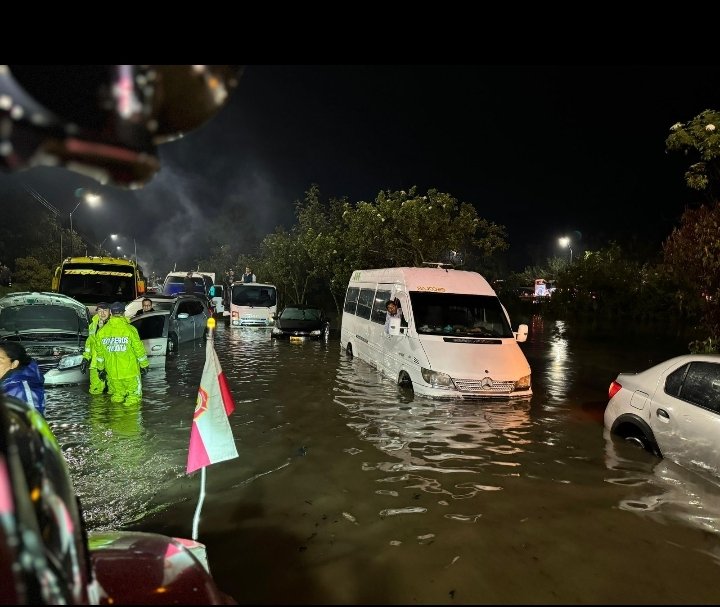 En la autopista decenas de vehículos quedaron anegados , buses escolares con niños no han podido llegar a sus hogares .
