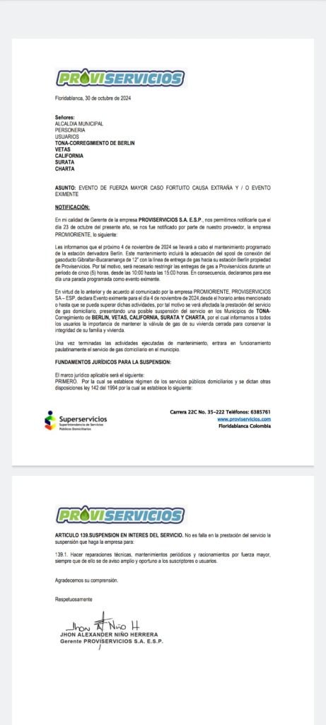 (#Tona, #Vetas, #California, #Suratá y #Charta) tendrán suspención del servicio de gas domiciliario. Según @proviservicios en la estación Berlín se realizará mantenimiento del gasoducto #Gibraltar – #Bucaramanga👇 👷🔩