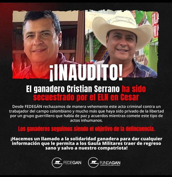 El empresario y ganadero de 60 años, fue plagiado en la finca Las Marías dónde «llegó un grupo de personas que amedrentó al ganadero, lo amarró y se lo llevó de su propia finca. Ante este hecho, como Gobierno del Cesar, lo rechazamos enfáticamente, ya que es una situación que se ha vuelto reiterativa en el sector de Montecitos, donde el ELN ha perpetrado secuestros” informó a la cadena Caracol Cesar Eduardo Esquivel, secretario de Gobierno del departamento del Cesar.